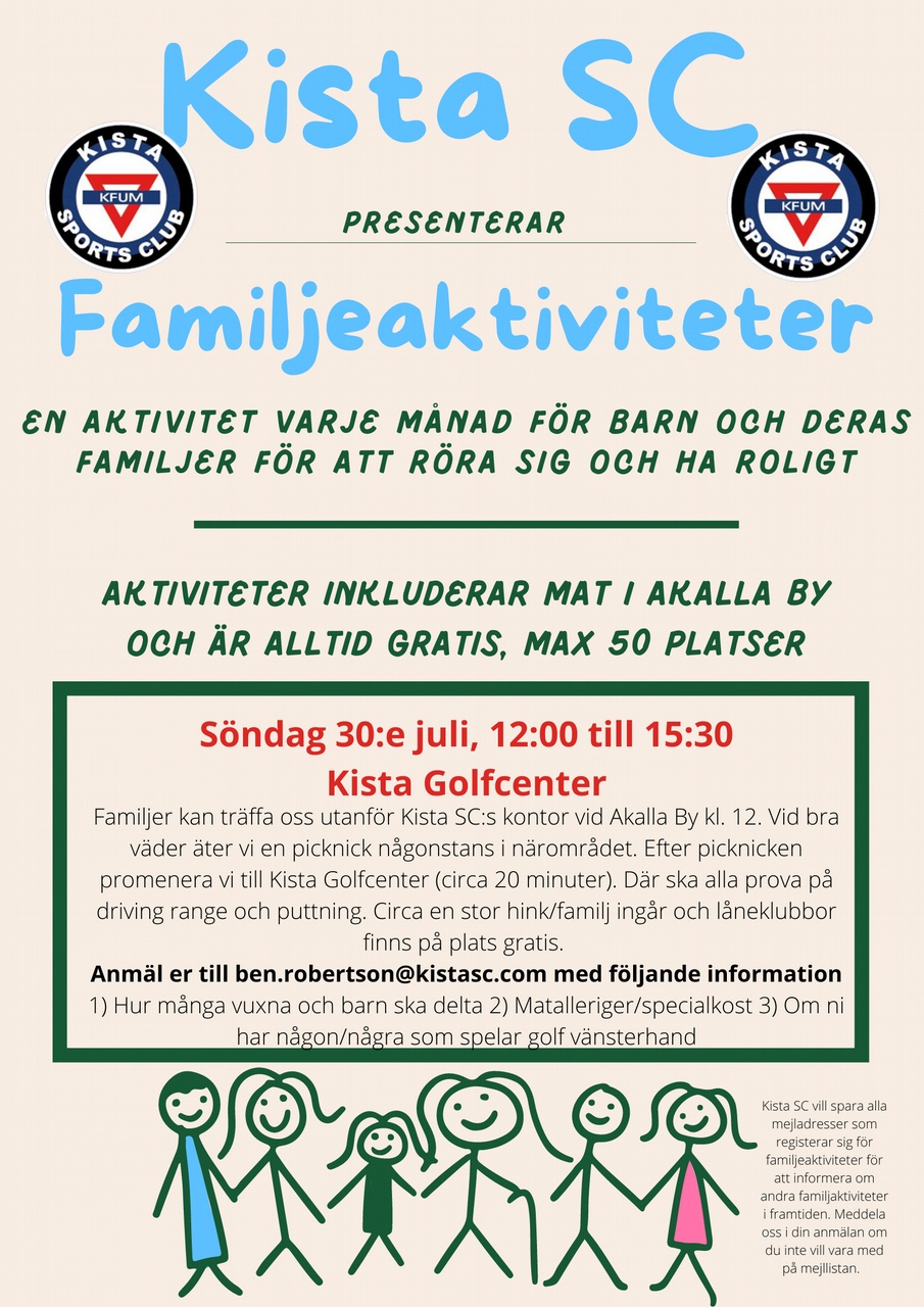 Familjer kan träffa oss utanför Kista SC:s kontor vid Akalla By kl. 12. Vid bra väder äter vi en picknick någonstans i närområdet. Efter picknicken promenera vi till Kista Golfcenter (circa 20 minuter). Där ska alla prova på driving range och puttning. Circa en stor hink/familj ingår och låneklubbor finns på plats gratis.
