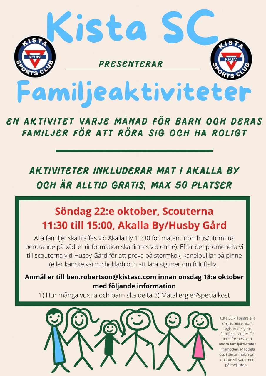 Alla familjer ska träffas vid Akalla By 11:30 för maten, inomhus/utomhus berorande på vädret (information ska finnas vid entre). Efter det promenera vi till scouterna vid Husby Gård för att prova på stormkök, kanelbulllar på pinne (eller kanske varm choklad) och att lära sig mer om friluftsliv.