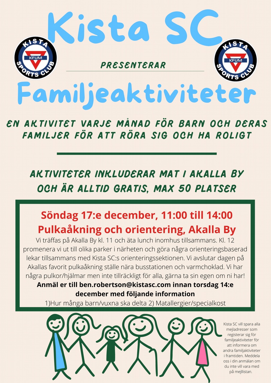 Vi träffas på Akalla By kl. 11 och äta lunch inomhus tillsammans. Kl. 12 promenera vi ut till olika parker i närheten och göra några orienteringsbaserad lekar tillsammans med Kista SC:s orienteringssektionen. Vi avslutar dagen på Akallas favorit pulkaåkning ställe nära busstationen och varmchoklad. Vi har några pulkor/hjälmar men inte tillräckligt för alla, gärna ta sin egen om ni har!