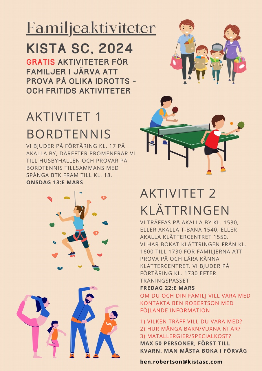 Onsdagen den 13:e mars och fredagen den 22:e mars organiserar Kista SC familjeaktiviteter för familjerna i Järva.