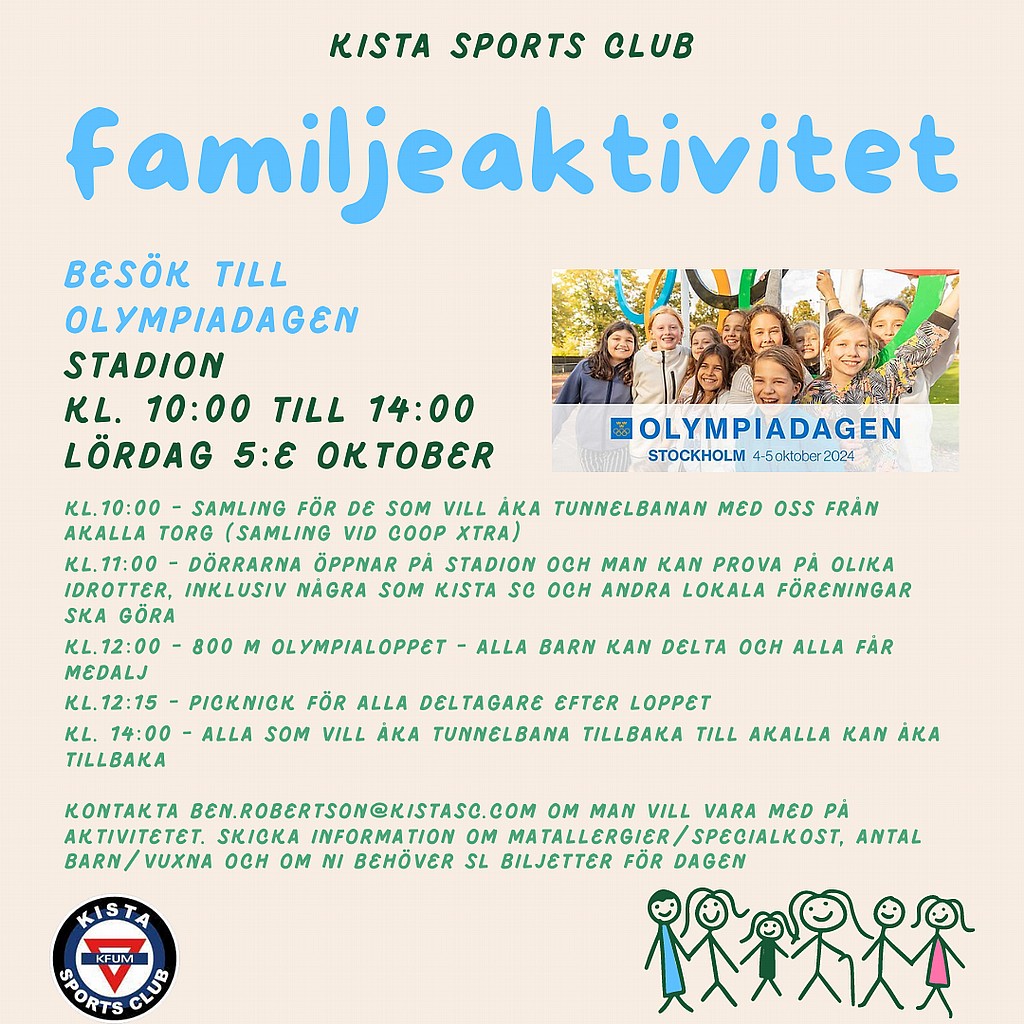 Kontakta ben.robertson@kistasc.com om man vill vara med på aktivitetet. Skicka information om matallergier/specialkost, antal barn/vuxna och om ni behöver sl biljetter för dagen