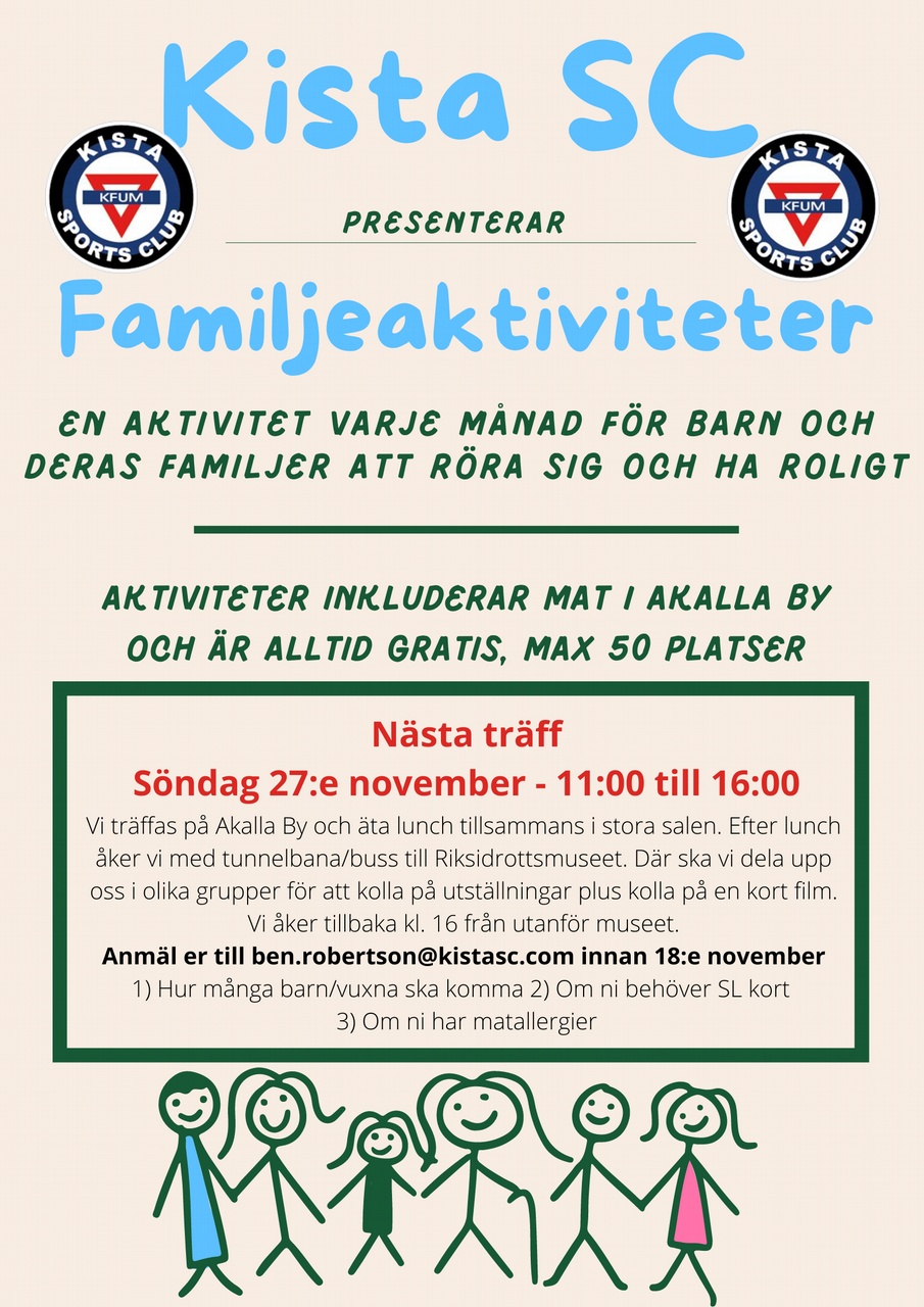Vi träffas på Akalla By och äta lunch tillsammans i stora salen. Efter lunch åker vi med tunnelbana/buss till Riksidrottsmuseet. Där ska vi dela upp oss i olika grupper för att kolla på utställningar plus kolla på en kort film. Vi åker tillbaka kl. 16 från utanför museet.