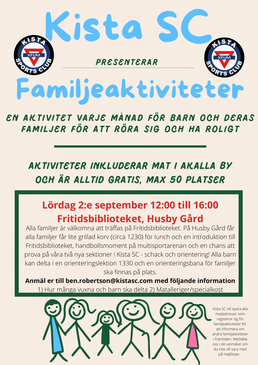 Orienterings lektionen börjar 13:30 på Husby Gård men aktiviteter är på plats kl. 12-16. Anmälan till familjeaktiviteter är till ben.robertson@kistasc.com